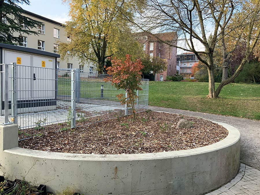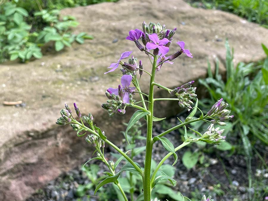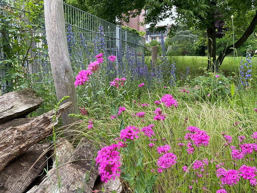 Solche Flächen reizen Gartengestalter und Naturgärtner: Ein kümmernder Acer palmatum, der in einer trostlosen Rindenmulchwüste steht. Mit liegendem und stehendem Lebensraumholz, einem großen Sandstein, mineralischem Substrat, ein paar Pflanzen und etwas Samen wird es gut. Nach zwei Jahren Entwicklung ist das Hochbeet in Schwung gekommen und die duftende Hesperis matronalis hat sich etabliert. Auch schon in der Nachbarschaft. Zur Freude derselben.