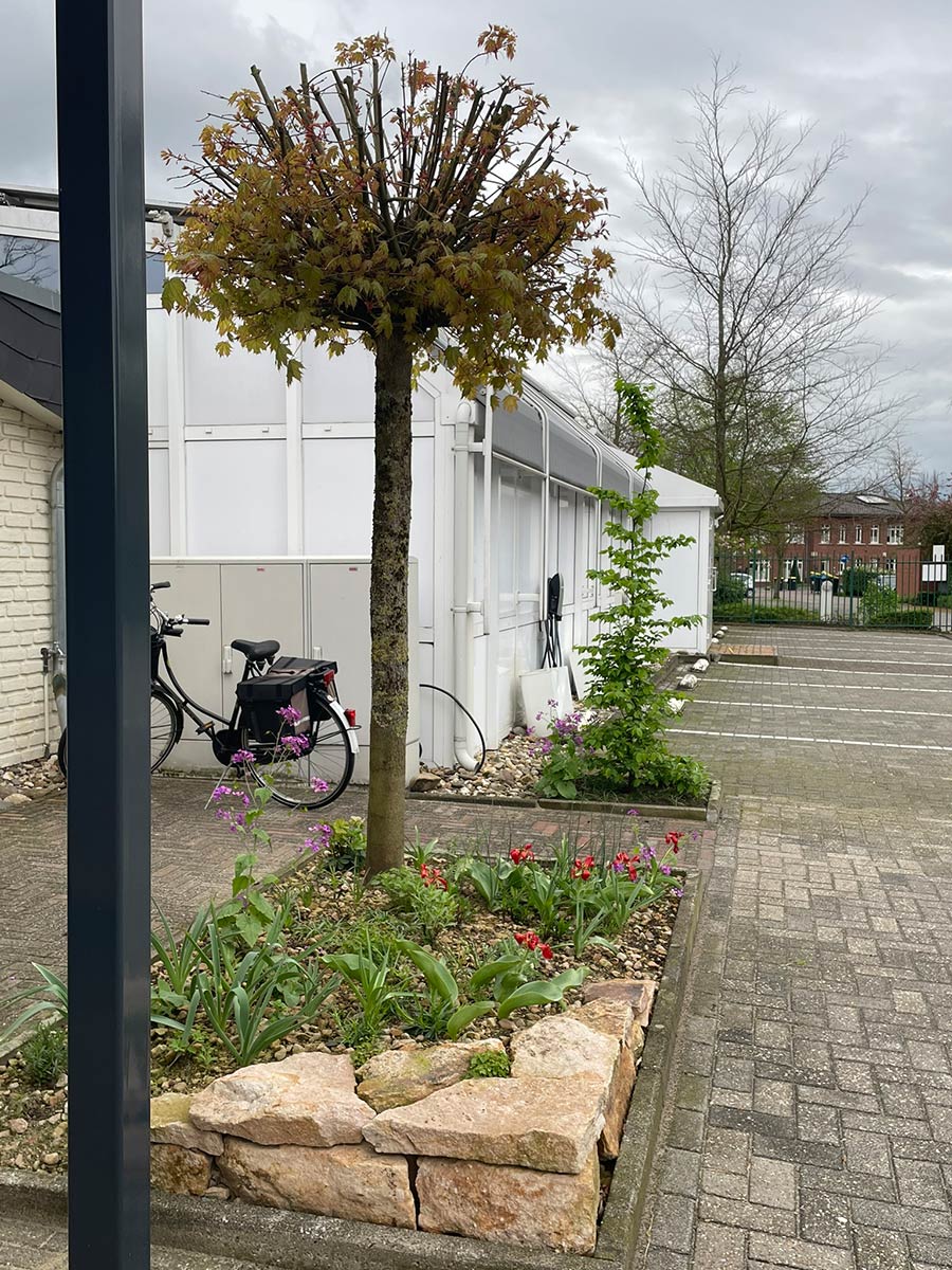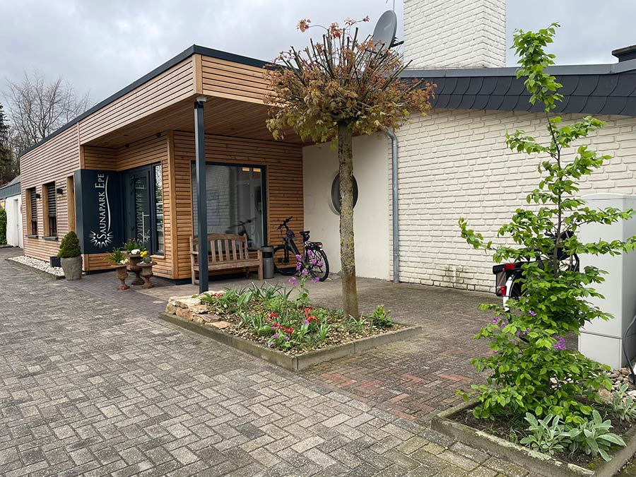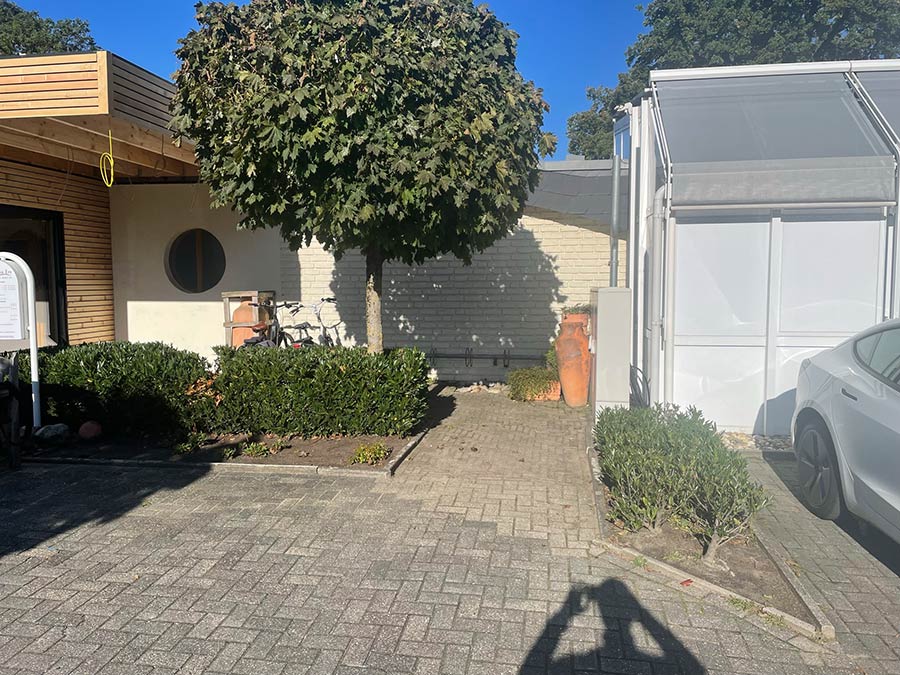 Im Saunapark Epe wurde im Herbst 2023 der komplette Eingangsbereich umgebaut. Unsere Aufgabe war es, die bestehenden Pflanzbeete umzugestalten, Regenwasserfallrohre an das Kanalgrundrohr anzuschließen, die Pflasterung anzupassen und die Beete neu zu bepflanzen. Dabei haben wir an dem bestehenden Acer platanoides 'Globosum' festgehalten, die Fahrradparkplätze und Zugänge vergrößert, sowie bauseits vorhandenes Pflaster verwendet.