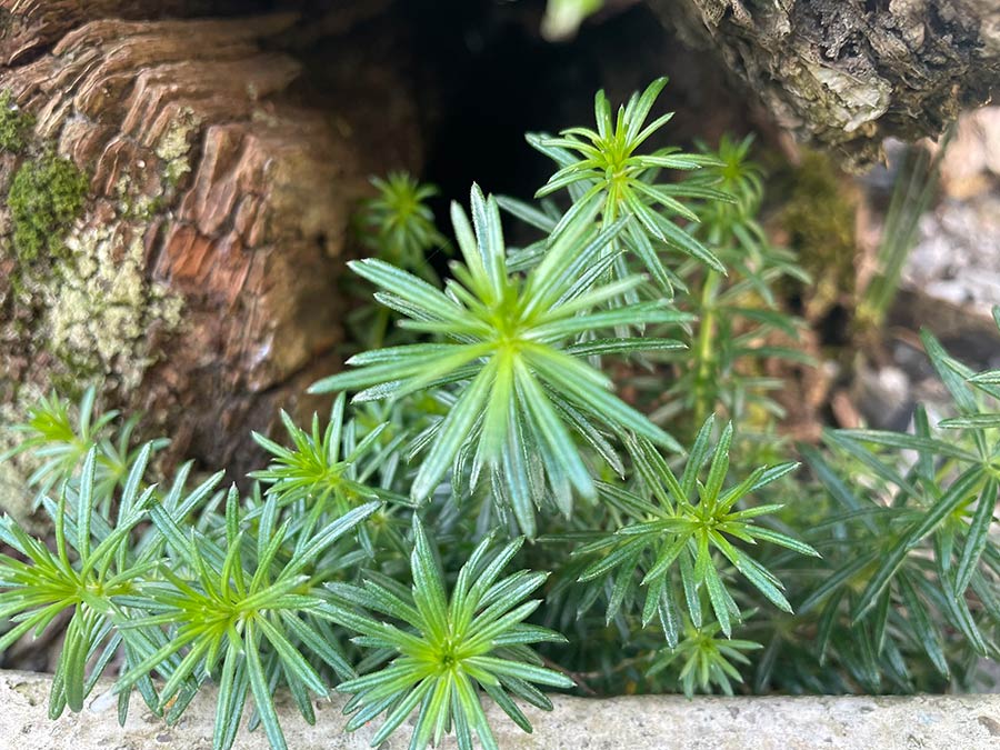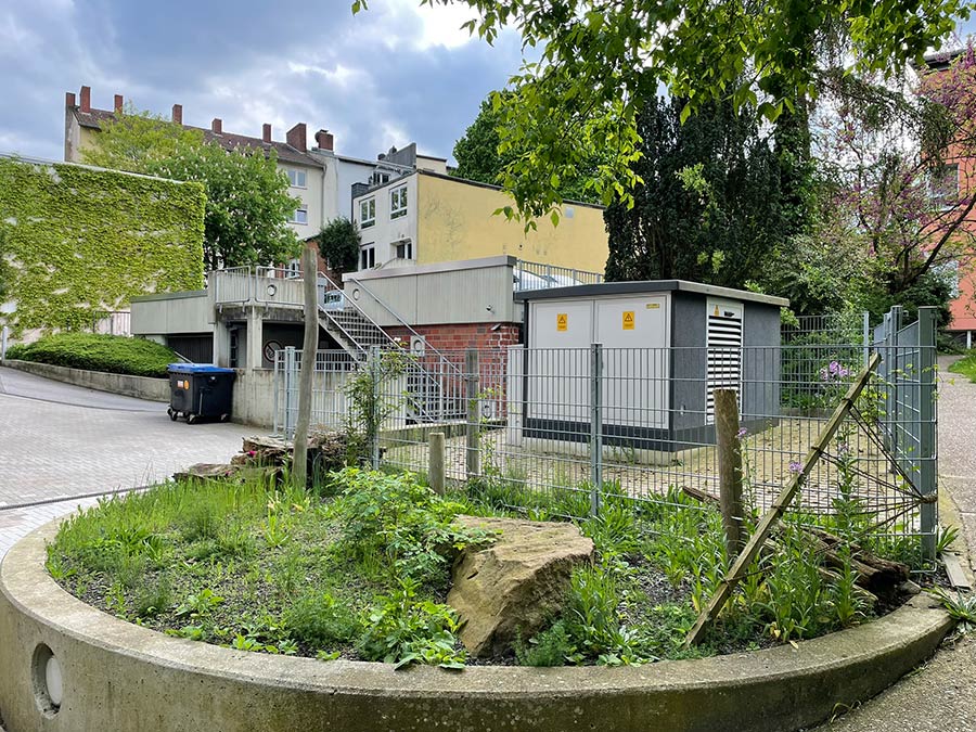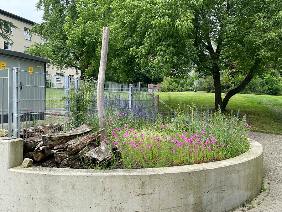 Solche Flächen reizen Gartengestalter und Naturgärtner: Ein kümmernder Acer palmatum, der in einer trostlosen Rindenmulchwüste steht. Mit liegendem und stehendem Lebensraumholz, einem großen Sandstein, mineralischem Substrat, ein paar Pflanzen und etwas Samen wird es gut. Nach zwei Jahren Entwicklung ist das Hochbeet in Schwung gekommen und die duftende Hesperis matronalis hat sich etabliert. Auch schon in der Nachbarschaft. Zur Freude derselben.