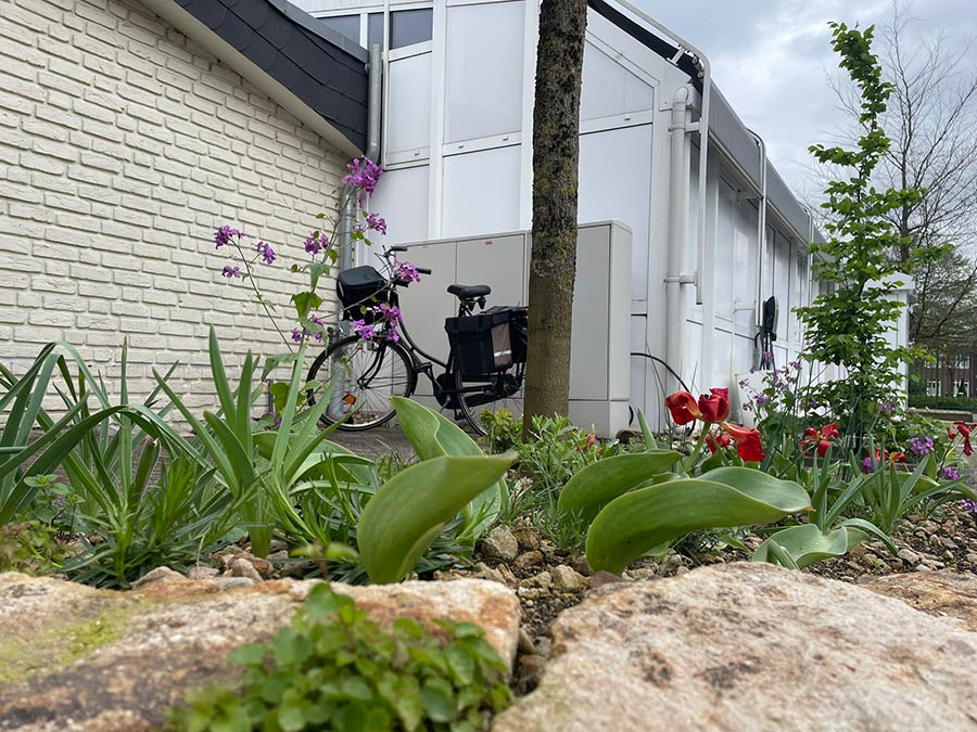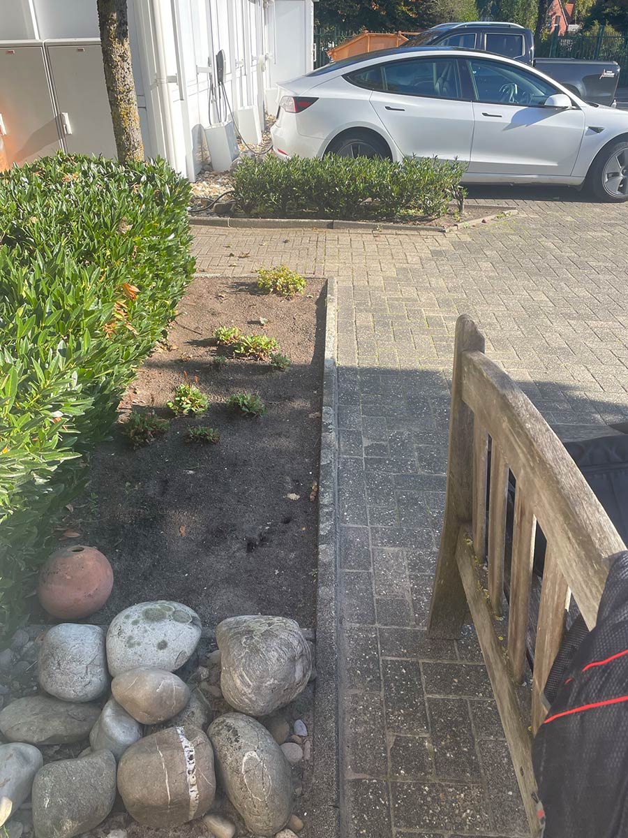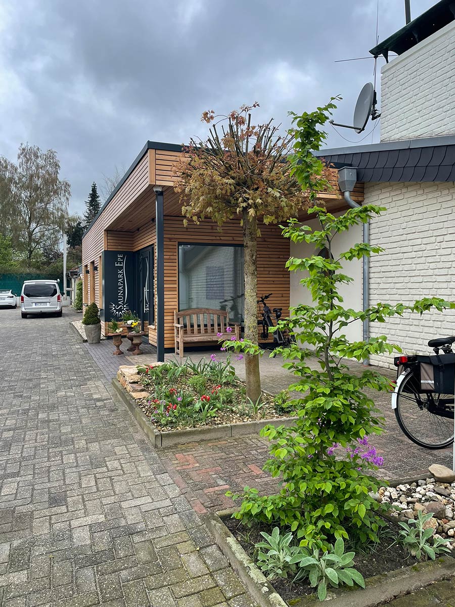 Im Saunapark Epe wurde im Herbst 2023 der komplette Eingangsbereich umgebaut. Unsere Aufgabe war es, die bestehenden Pflanzbeete umzugestalten, Regenwasserfallrohre an das Kanalgrundrohr anzuschließen, die Pflasterung anzupassen und die Beete neu zu bepflanzen. Dabei haben wir an dem bestehenden Acer platanoides 'Globosum' festgehalten, die Fahrradparkplätze und Zugänge vergrößert, sowie bauseits vorhandenes Pflaster verwendet.